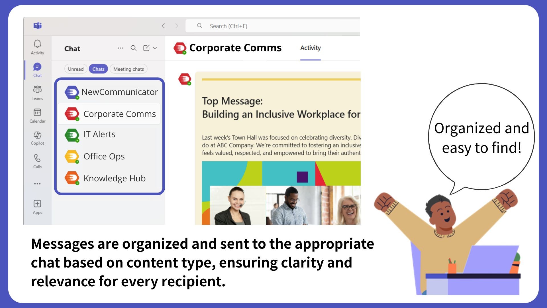 Previously, all messages — whether from HR, IT, or even the CEO — were delivered into a single chat. This often led to mixed content and made it harder for recipients to find what they needed.