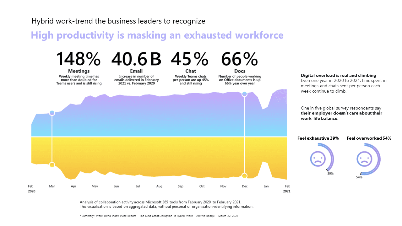 There were several findings for Microsoft between 2020 and 2022, when many companies took steps towards hybrid work. In our published “Work Trend Index Report”, we have identified the following two issues.
